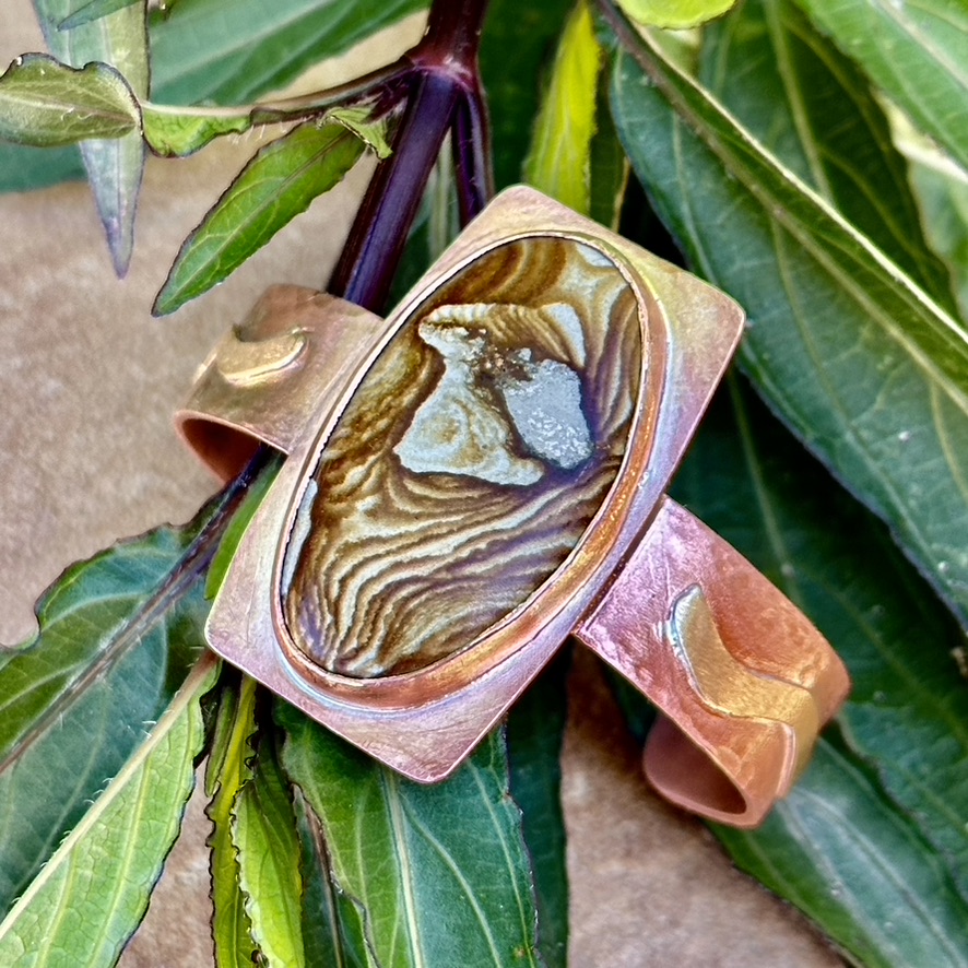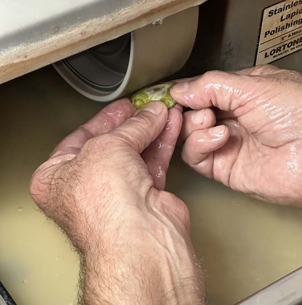 Following their frequent road trips to find rocks, Larry will spend much of his time inspecting the finds and deciding which will make the most beautiful cabochons. He then slices the rock, and uses a stencil to choose the cabochon shape. After he has done this, he will saw around the stone, to cut out the shape he has drawn. Larry will take the stone to the grinder to smooth and to round it off. Finally, he will polish the stone to a high luster. It is a lengthy process, but he enjoys each step.