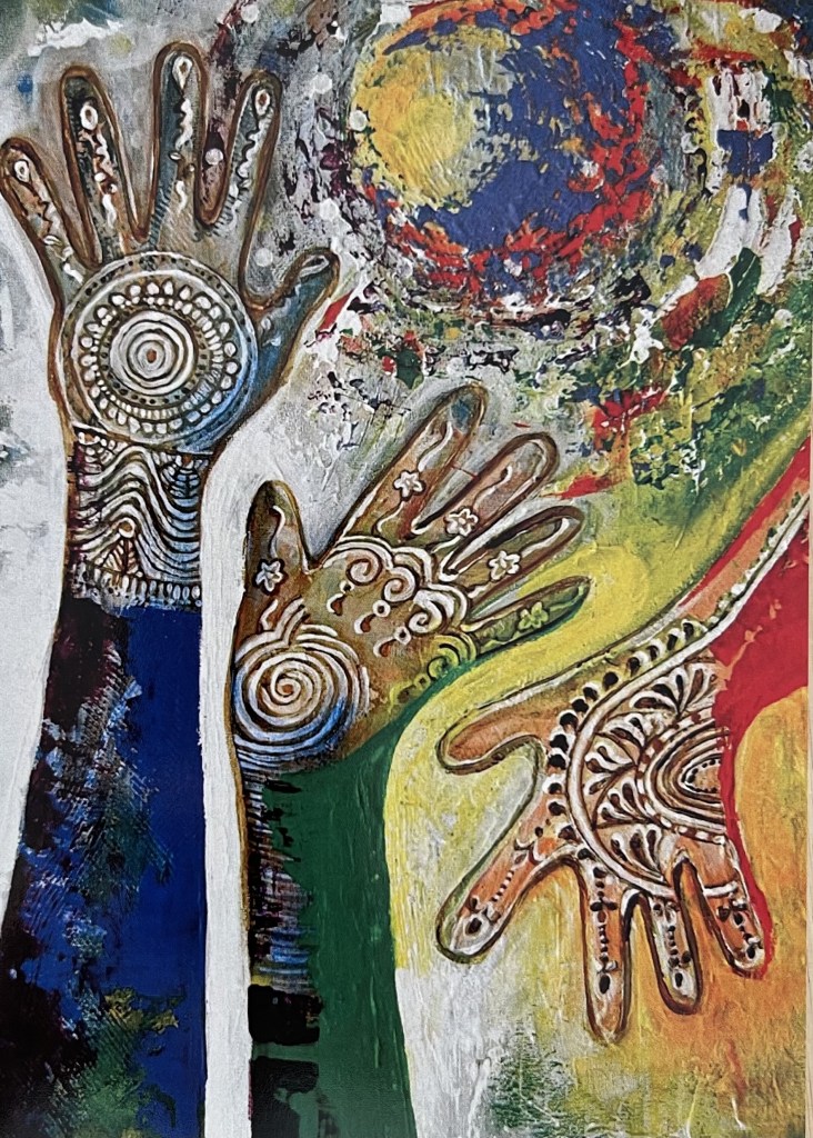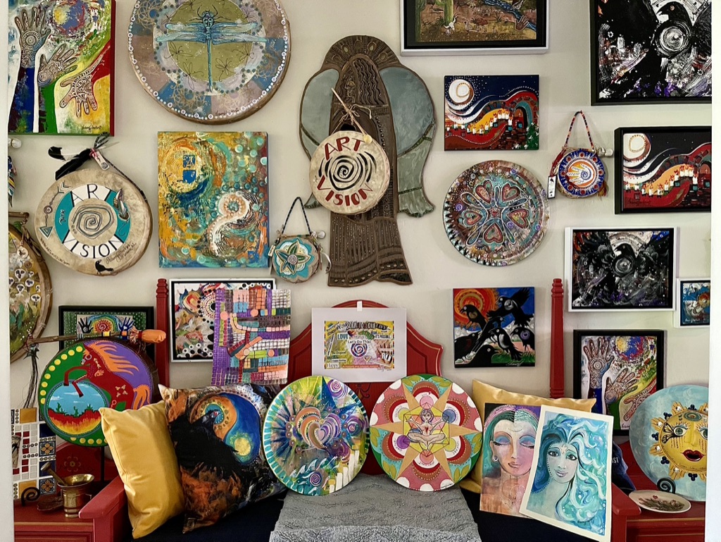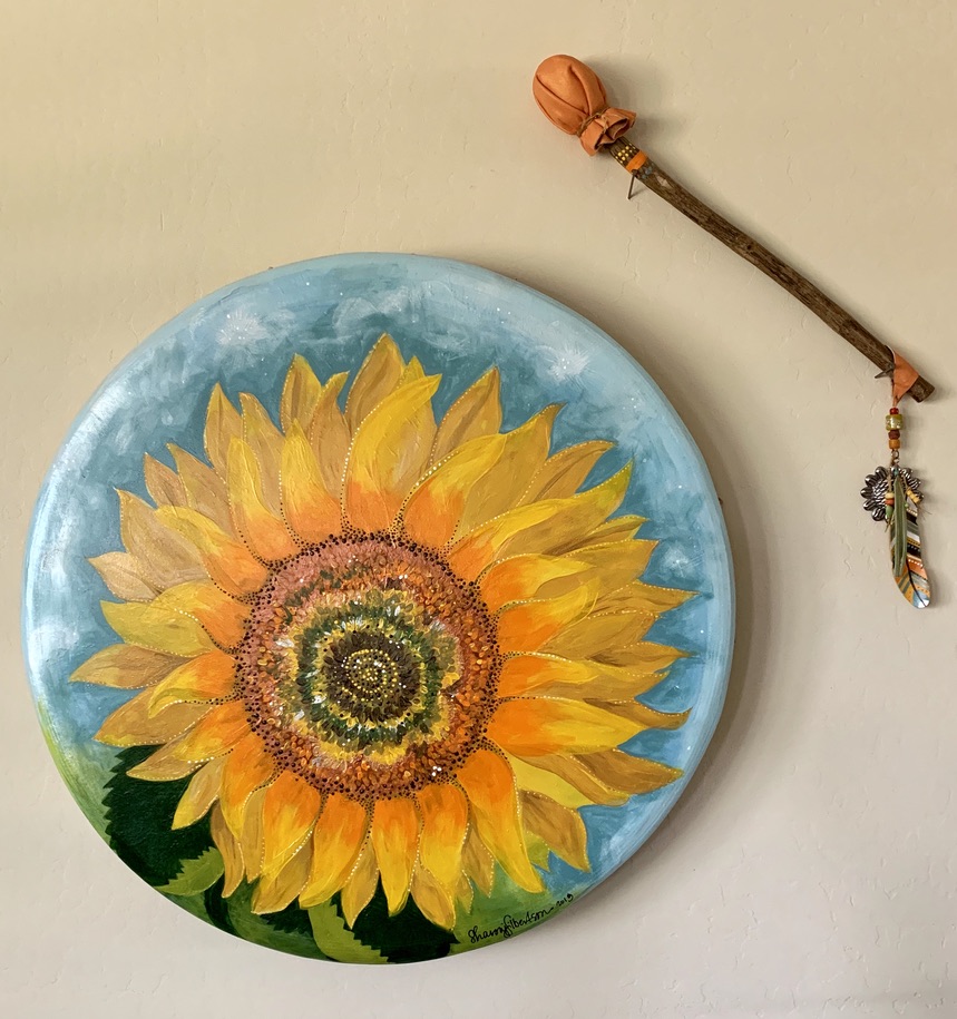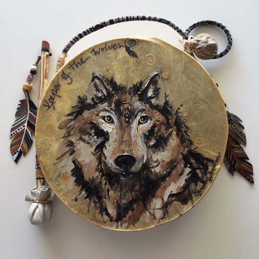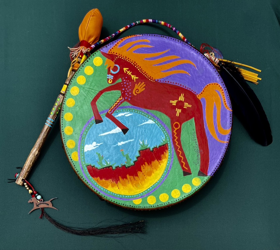 I’m doing less painting on canvases and more painting on rawhide and leather; simply because I enjoy it so much. I love painting, so canvas can still be a wonderful surface to express my visions and ideas. Acrylics continue to be my choice of medium because of their bright colors, versatility and they dry quickly, especially in our desert climate. Here’s a sampling of my art work on varied surfaces, other art can be viewed throughout this website.